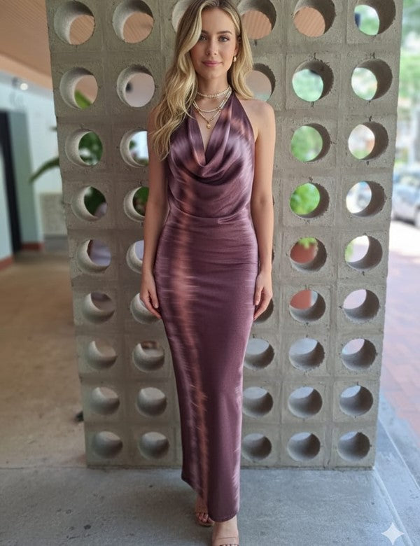 Este vestido estampado de cuello halter largo es la definición de elegancia y frescura. Su diseño resalta los hombros y el cuello, mientras que su estampado vibrante y caída fluida crean un look sofisticado y cómodo. Perfecto para eventos especiales o días de verano, es una prenda que deslumbra con estilo.
